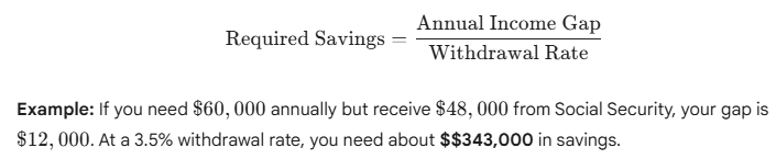 | Requires $\$5$ million in savings. | To sustain $65,000 spending (at a 3.5% withdrawal rate), you need roughly $1.7 million—a fraction of the $5 million target. |