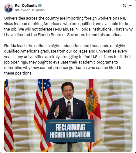 - The Ban: DeSantis has directed the Florida Board of Governors to “pull the plug” on using H-1B visas in state higher education.