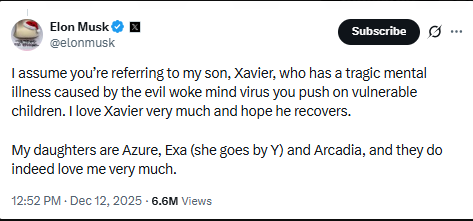 Musk responded by stating: “I assume you’re referring to my son, Xavier, who has a tragic mental illness caused by the evil woke mind virus you push on vulnerable children.” He affirmed his love for his child and expressed a hope for their “recovery.”