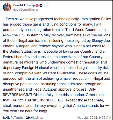 - Reverse Migration: Trump vowed to pursue “REVERSE MIGRATION,” which would involve revoking the citizenship and legal status of foreign nationals he believes undermine domestic tranquility or are “non-compatible with Western Civilization.”