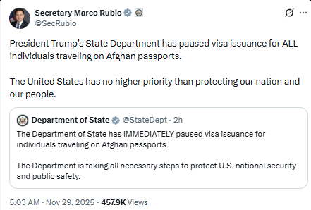 - Afghan Visa Freeze: The State Department, led by Secretary Marco Rubio, announced an immediate freeze on visa issuance for ALL individuals traveling on Afghan passports. This action triggers a fresh review of over 100,000 pending Afghan immigration cases.