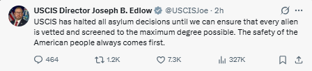 - Total Asylum Freeze: US Citizenship and Immigration Services (USCIS) Director Joseph Edlow confirmed the immediate pause on all asylum rulings. Edlow stated the pause will remain until every applicant can be “vetted and screened to the maximum degree possible” to ensure the safety of the American people.