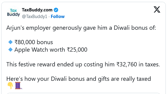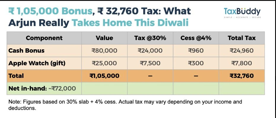 Arjun’s total tax hit from his Diwali package was ₹32,760 (₹24,960 for the bonus + ₹7,800 for the gift).