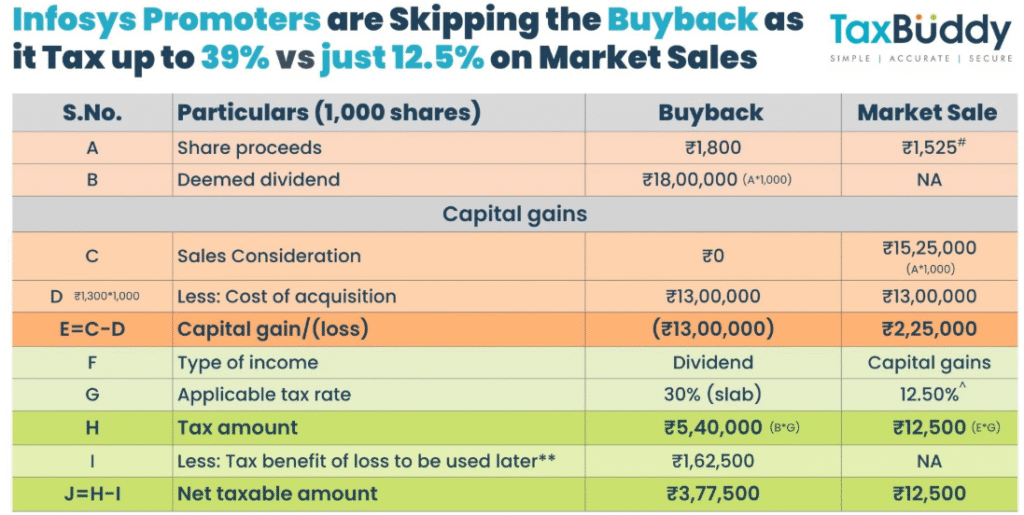The Financial Killer: Under the new rule, the entire payout of ₹1,800 per share (in the Infosys case) is taxed at the highest slab rate. As experts note, a 35.88% tax on ₹1,800 is $\approx$ ₹646 per share. This leaves the promoter with a net amount of only ₹1,154, which is significantly less than the market price (around ₹1,472), making the buyback economically unviable.