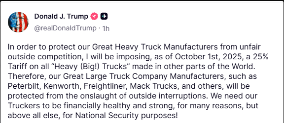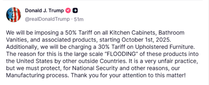 U.S. President Donald Trump has announced a new round of sweeping import taxes, stating that manufacturers must “build here or pay up.” These tariffs, which are set to take effect on October 1, include a 100% tax on pharmaceutical drugs, 50% on kitchen cabinets and bathroom vanities, 30% on upholstered furniture, and 25% on heavy trucks.