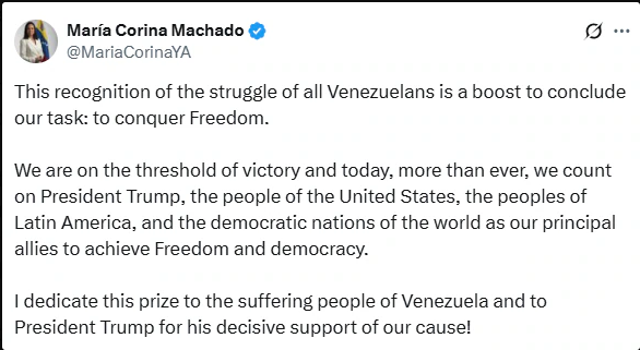 Thank you for reading this post, don't forget to subscribe!Machado confirmed this sentiment in a post on X, dedicating the prize not only to the people of Venezuela but also to “President Trump for his decisive support of our cause!”