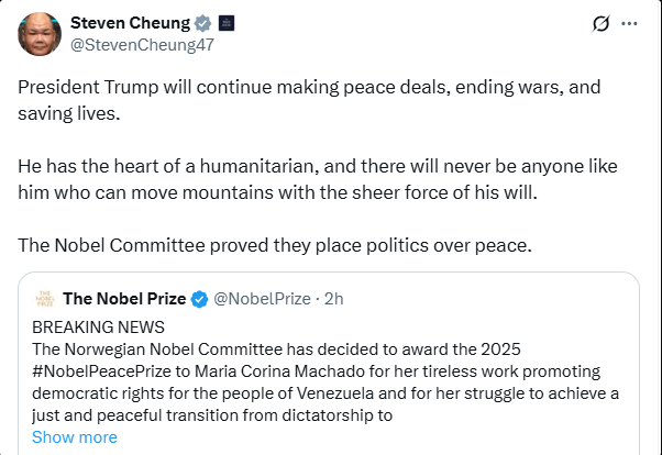 - White House Criticism: White House spokesperson Steven Cheung criticized the Nobel Committee’s decision, suggesting it prioritized “politics over peace” by not recognizing Trump’s efforts.