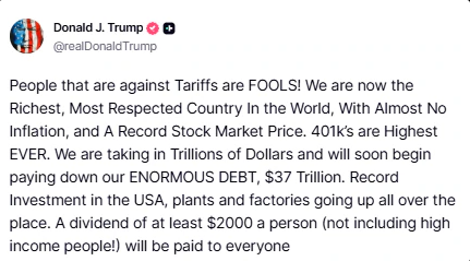 US President Donald Trump has doubled down on his aggressive tariff policy, proclaiming that “People that are against Tariffs are FOOLS!” and vowing to use the revenue for a massive national dividend and debt reduction.