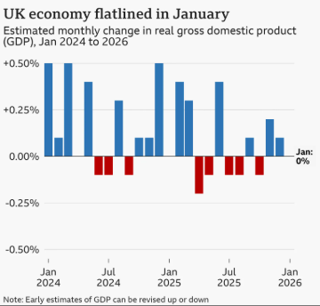 The UK economy ground to a halt in January 2026, missing growth forecasts as the hospitality sector slumped and the outbreak of the US-Israeli war with Iran sent fresh shockwaves through global energy markets.