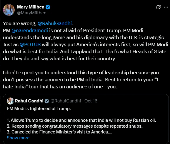 US singer and staunch Modi supporter Mary Millben has fired back at Congress leader Rahul Gandhi following his claims that Prime Minister Narendra Modi was “frightened of Trump” and allowing the US to dictate India’s Russian oil policy.